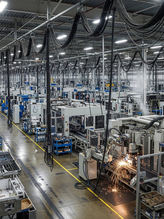 A wide view of a busy factory floor filled with automated machinery, robotic arms, and overhead cables, with sparks flying from a welding operation.