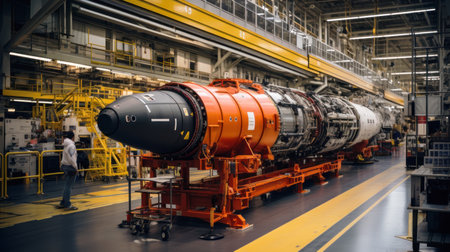 Space rocket inside modern aerospace factory, tech product is in assembly shop of plant. Concept of industry, technology, interior, manufacturing, science, machinery, business. Generative AI.