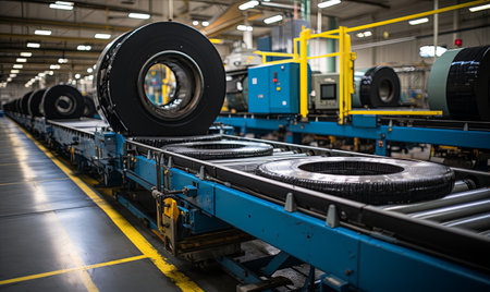 A factory scene with conveyor belts transporting a large tire through the production process.