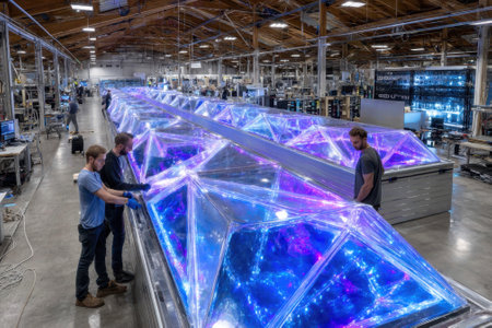 Three individuals collaboratively work on a series of triangular light structures in a vast workshop.