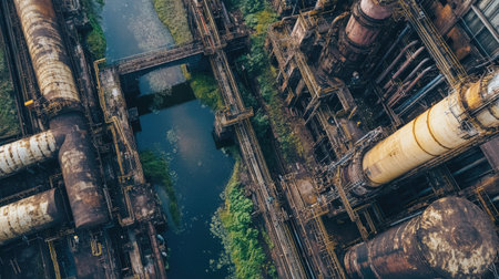 Captivating aerial perspective of an industrial site showcasing arranged machinery and structures, providing insight into operational logistics and urban infrastructure.
