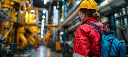 A person in a safety helmet stands in an industrial facility surrounded by machinery focusing on work processes and safety measures.