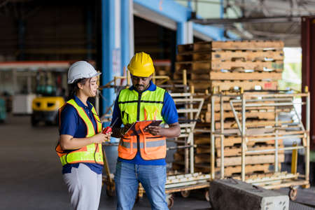 Hispanic Indian engineer worker working in port shipping cargo together. woman work with male in warehouse industry.