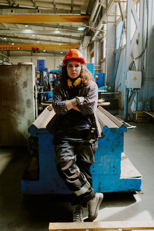 Portrait of young adult Caucasian woman wearing hard hat sitting on industrial equipment in factory workshop crossing arms and looking into camera