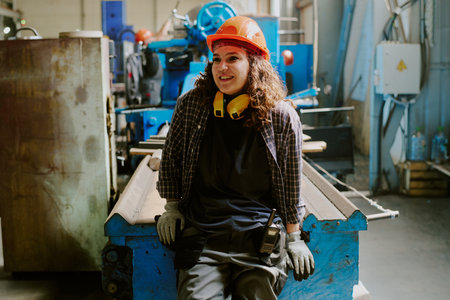Caucasian young adult woman wearing protective helmet and gloves sitting on industrial machine in factory workshop smiling and looking away from camera during break