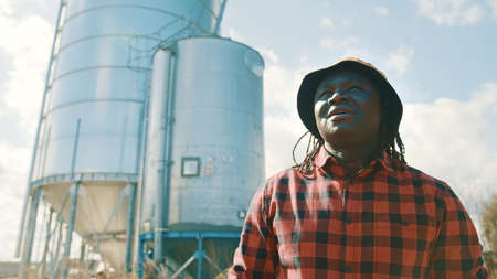 Young handsome african farmer standing in front of the silo system. High quality photo