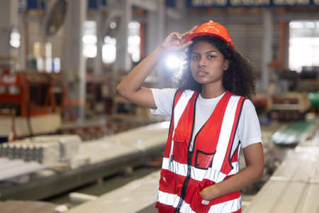 Female apprentice in metal working factory, Portrait of working female industry technical worker or engineer woman working in an industrial manufacturing factory company.