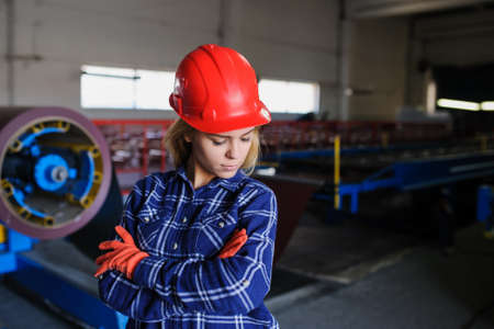 beautiful woman in red safety helmet work as industrial worker at metal sheet profiling mechine at manufacturing factory