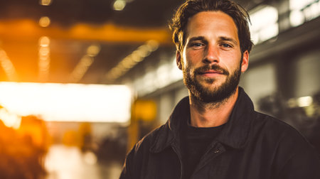 A self-assured young man with a neatly groomed beard stands in a sleek, contemporary interior as warm sunset light filters through windows, creating a welcoming atmosphere.