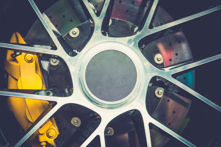 The brake system of a sport car,Car wheel - Close up of rims from a sports car , Part of modern new wheel car with disk brake pad