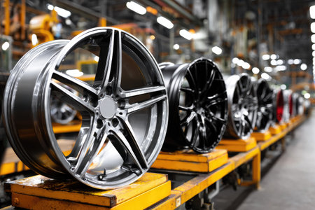 Manufacturing line is producing shiny new metal rims for the automotive industry