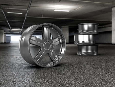 Polished chrome rim wheels in garage