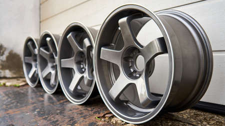close up view on beautifu ray alloy, aluminum, metal disks for car on stand in a shop. Car wheel disk
