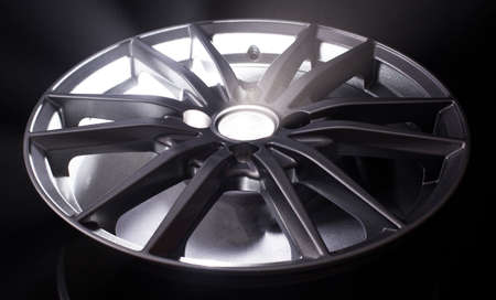 cast aluminum disc alloy wheel modern, close-up on black background, spokes and rim