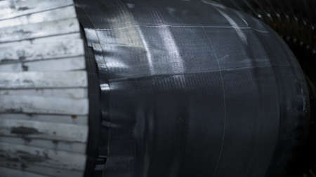 Tire manufacturing workshop worker checking production of robotic machine. Technological tyre stamping mechanism with rubber tape working process employee hands touching. Industrial automat concept