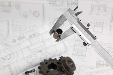 Metal cylinders and calipers on printed engineering drawings. Mechanics and Engineering Technology. Engineering drawings of steel parts