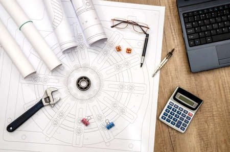 Engineer work. Drawings, measuring tools and details of chains on the table.