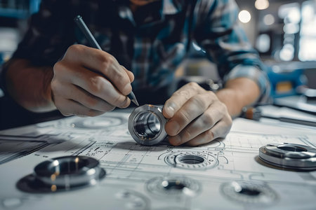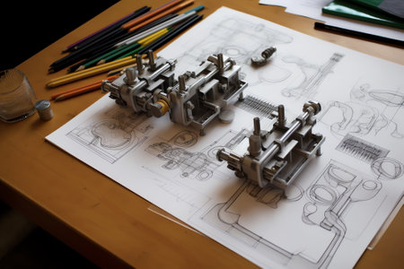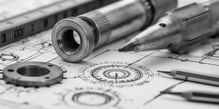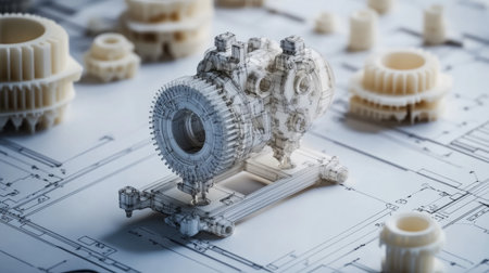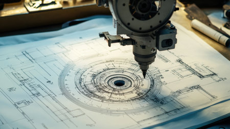 A close-up view of a mechanical component resting on detailed technical drawings. This image captures the essence of engineering design and precision workmanship.