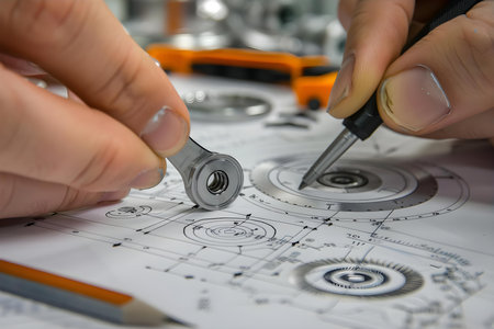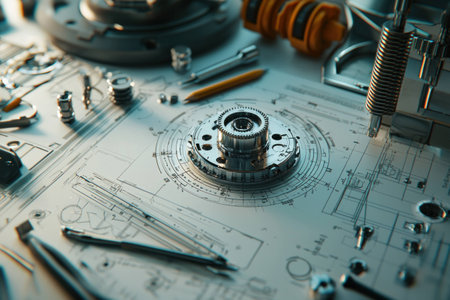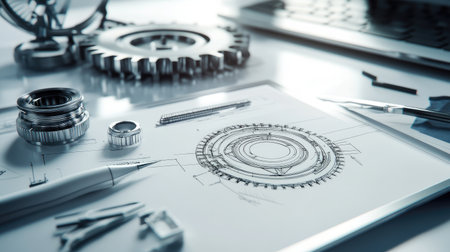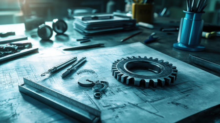 High detail close up of mechanical engineering tools and a gear on blueprints, emphasizing precision and creativity in craftsmanship