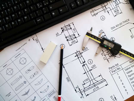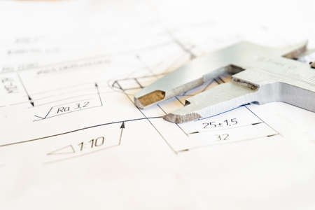 The caliper lies on the technical drawing, after the technical process has been completed.