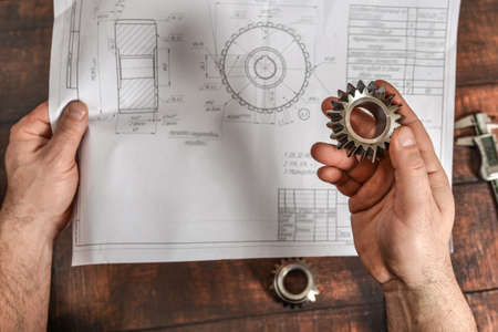 The working engineer holds a bevel gear in his hand against the background of a technical drawing