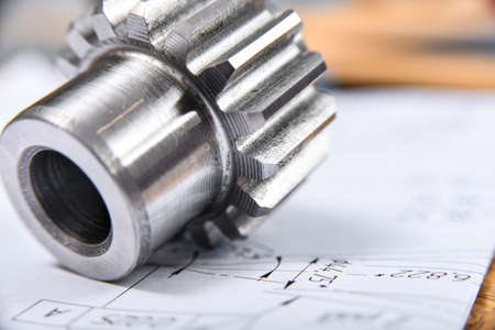 A cogwheel made on a gear cutting machine lies on the technical drawings
