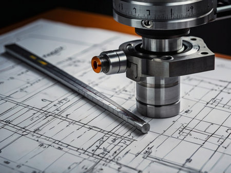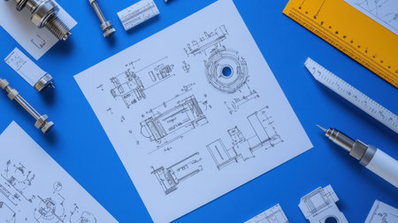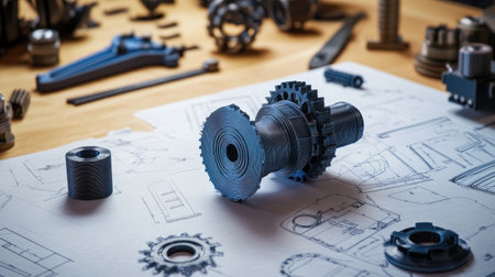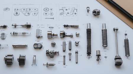 High-precision metal components and machine parts arranged beside technical drawings in an engineering lab
