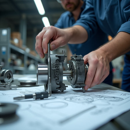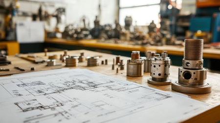 A detailed technical drawing lies on a workbench alongside precision components in an industrial workshop. The setting showcases a blend of craftsmanship and engineering, highlighting the tools and materials used in machinery production.