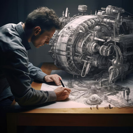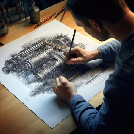 Engineer working on a technical drawing of a car engine. Close-up.