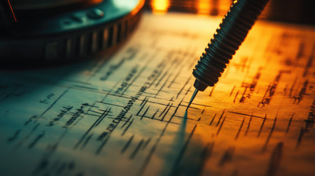 A close-up image capturing a pen in motion across detailed blueprints and technical drawings, highlighting creativity in a workspace filled with warm light.