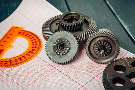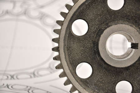 Metal gear on the background of drawings. Spare parts.