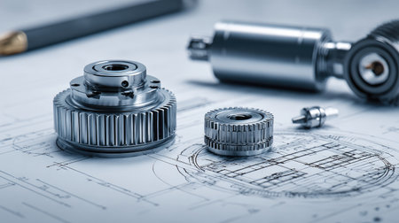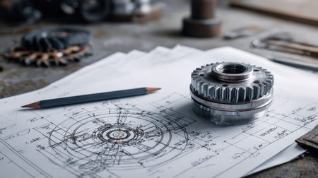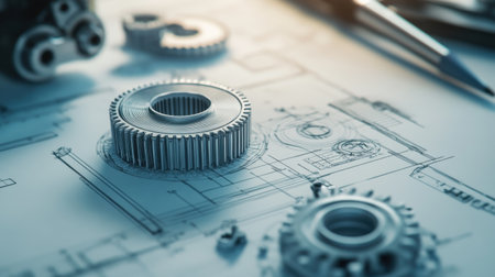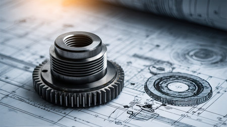 A stunning close-up of a metal gear placed on detailed engineering drawings, showcasing precision and the essence of mechanical design in an industrial workshop.
