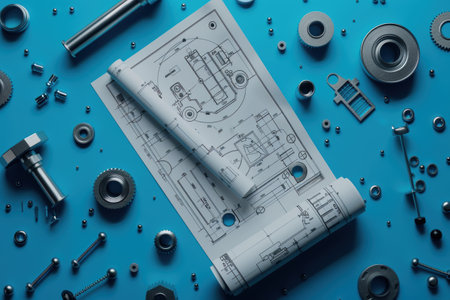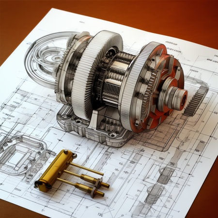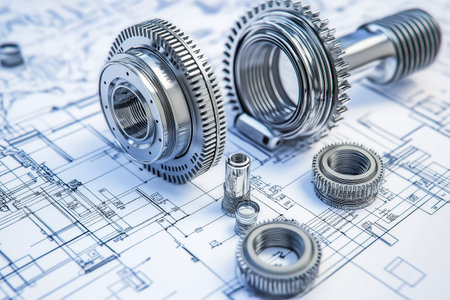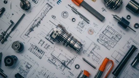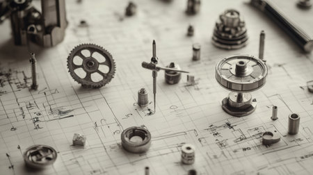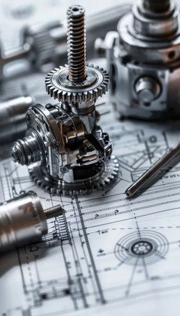 An array of mechanical components spread over technical blueprints, capturing the precision and artistry of mechanical engineering.