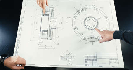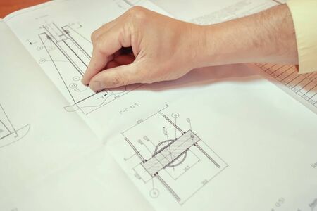 Work on a drawing of a diagram by an engineer. Engineers hand over the drawing.