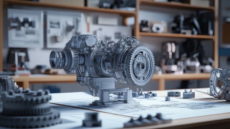 A realistic 3D model showcasing intricate mechanical parts and engineering components set in a modern workshop. This image highlights design and precision in technology.