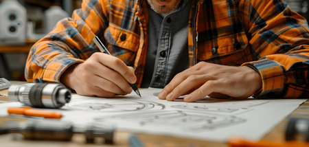 Close-up of the hands of a craftsman drawing a sketch on a paper
