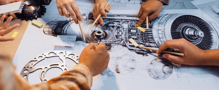Engineers collaborate on technical drawings and mechanical schematics, showcasing hands-on teamwork and creative problem-solving in an engineering project environment.