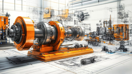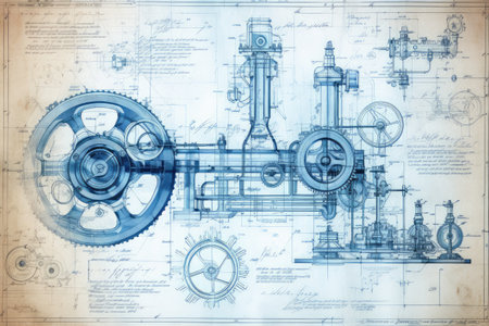 Explore a detailed illustration of vintage machinery with intricate components and blueprint elements, showcasing the blend of art and technology in engineering design.