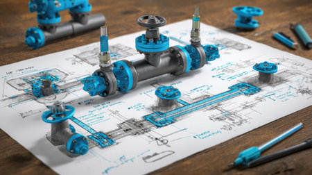 Water engineering system sketch with valves, pipelines, and flow sensors on table
