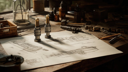A nostalgic workshop scene featuring spark plugs and detailed technical drawings illuminated by soft light. Perfect for showcasing craftsmanship and design.