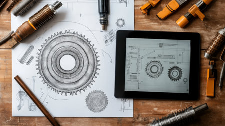 Detailed view of industrial gears and mechanical parts placed on engineering design sketches, showcasing tools and equipment on a wooden workspace.