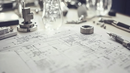 Precision tools and metallic connectors laid out on a detailed engineering diagram evoke meticulous planning and proactive craftsmanship.