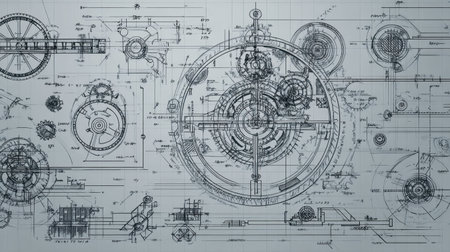 Intricate technical drawing showcasing complex machinery with gears and schematics. Ideal for engineering, design projects, and inspiring innovative creations.