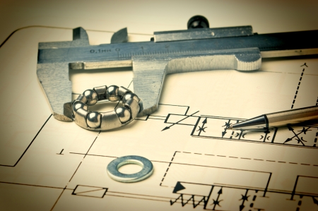 Ball bearing and caliper on the background of drawings