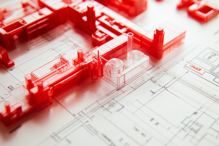 Comprehensive engineering blueprint featuring distinct red components and precise measurements