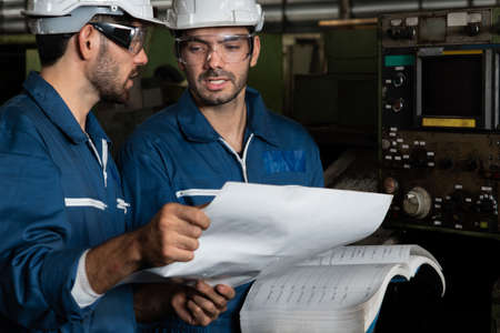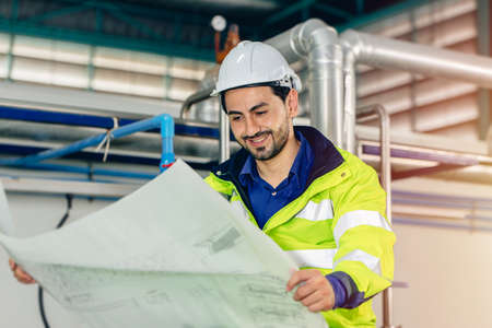 engineer worker with floor plan blueprint paper of machine service instruction working in factory