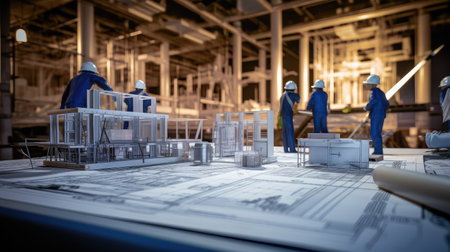 Manager supervisor, engineer and industrial worker in uniform discussing blueprints in large metal factory hall.