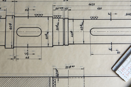 Metal cylinders and calipers on printed engineering drawings. Mechanics and Engineering Technology. Engineering drawings of steel parts