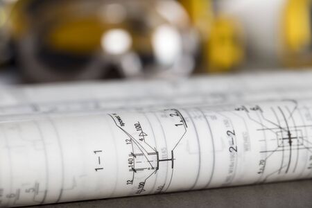 Rolls of drawings. Selective focus on working drawings. Bright light on the desktop construction engineer