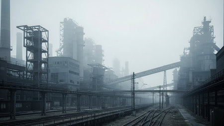 An industrial factory complex shrouded in fog with multiple railroad tracks running through the scene.